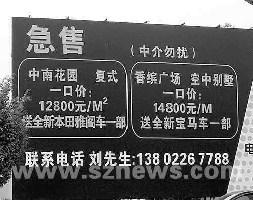 最大的一塊廣告牌矗立在白石路與科苑南路交匯處的西南側,約10平方米大小,黑白分明的底色,端端正正的橙色粗體字格外引人注目。“急售”字樣下有兩個橢圓形框,框內寫明了具體出售內容,一個是“中南花園,復式,一口價:12800元/平方米,送全新本田雅閣車一輛”,另一個是“香繽廣場,空中花園,一口價:14800元/平方米,送全新寶馬車一部”。廣告牌下端還留下了業主劉先生的手機號碼,并特別注明“中介勿擾”。