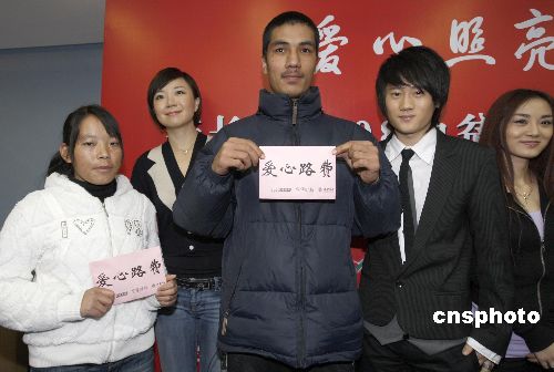 1月2日,臧天朔、葉蓓、江一燕等藝人在北京為不能回家過年的貧困大學生資助回家的路費。中國扶貧基金會“新長城”項目發起“愛心照亮回家路——資助貧寒學子回家過年”慈善活動,臧天朔等眾多藝人出席活動并現場捐款。此次活動將幫北京地區的眾多貧困大學學子得到回家過年的路費,讓他們能夠回家與家人團聚。中新社發 杜洋 攝