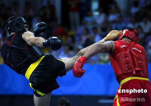 8月23日下午,在北京2008武術比賽男子散手70公斤級較量中,伊朗選手侯賽因·奧賈吉(黑方)戰勝巴西選手埃默松·諾蓋拉·阿爾梅達(紅方)。中新社發 宋吉河 攝