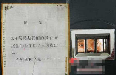 該小區(qū)物業(yè)辦工作人員說(shuō),十天前,小區(qū)里突然出現(xiàn)了十幾張通知,落款未寫(xiě)單位,但內(nèi)容很恐怖:如果三、四號(hào)樓的住戶不搬家,就殺他全家。“整個(gè)小區(qū)的人都人心惶惶的,特別是三、四號(hào)樓的200多個(gè)住戶,日夜守在家里,生怕沒(méi)人的時(shí)候房子被人強(qiáng)占。”該工作人員說(shuō)。