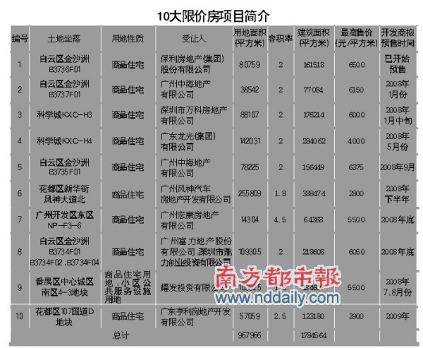 廣州將在今明兩年向市場(chǎng)推出10個(gè)限價(jià)房項(xiàng)目,最高限價(jià)6500元/平方米,最低只有2800元/平方米。昨日,廣州市國(guó)土房管局公布了這10個(gè)限價(jià)房項(xiàng)目的詳細(xì)情況和預(yù)計(jì)銷售時(shí)間。業(yè)內(nèi)人士分析指出,今年限價(jià)房的供應(yīng)比例占到廣州商品房市場(chǎng)的20%,將會(huì)壓制限價(jià)房周邊地區(qū)的房?jī)r(jià)。