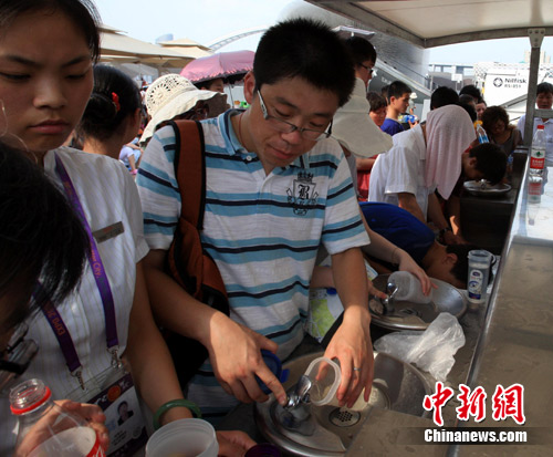 每天進入中國國家館的人在5萬人次左右,為確保預約期間和進入館內的游客能及時補充水分,世博局在中國館的10樓和12樓休息區,設立了2個直飲點,每個飲水點有3個出水口,優質直飲水“流淌”入中國國家館。