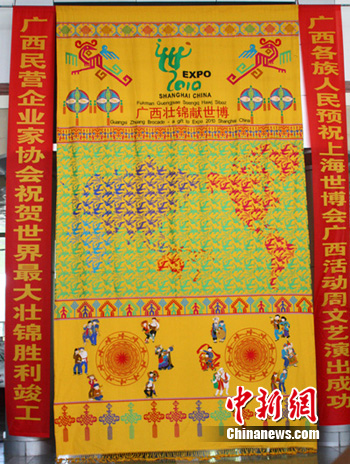 今天,由中國工藝織錦大師譚湘光和8名“織女”經過96天織就的世界最大壯錦,在“廣西活動周”開幕式上贈獻給上海世博會,壯錦長6.2米,寬3.6米。同時,“世界最長板鞋”亦亮相“廣西活動周”,該板鞋共23節,每節2.2米,總長為50.6米,由115位身穿少數民族盛裝的青年男女腳踏板鞋喊著號子向前行走。(完)