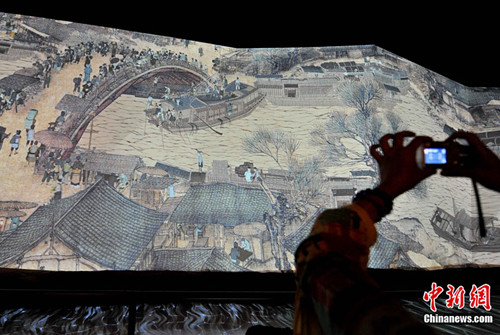 在中國館“智慧長河”展區,首先映入觀眾眼簾的,是投影到100多米長卷上的北宋畫家張擇端的《清明上河圖》所描繪的北宋汴梁城的場景。穿過該投影長廊,觀眾能近距離欣賞到另一個版本的《清明上河圖》——遼寧博物館藏的明代仇英版《清明上河圖》,該圖畫中人物超2000個,所描繪的明代蘇州市井生活的繁華程度遠遠超過宋代。