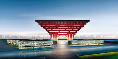 中國國家館以“東方之冠”為構思主題,取自中國古代木結構建筑中的元素——斗拱。16字設計理念體現了中國文化的深厚積淀:“東方之冠,鼎盛中華,天下糧倉,富庶百姓”。主色調運用傳統、沉穩的“故宮紅”。世博會期間,中國館將展現一幅宏偉的城市文明圖。