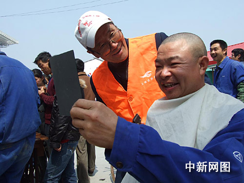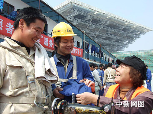 聽說服務(wù)“大篷車”要來,工地建設(shè)者早早作了準(zhǔn)備,穿破的衣褲,穿壞的鞋都拿了出來。一位來自河南,名叫張慶國(guó)的25歲民工,由于工地工作忙,已半年沒理發(fā)了,逢午飯休息間,他對(duì)理發(fā)的志愿者師傅說:“請(qǐng)幫我理了光頭吧,省得頭發(fā)長(zhǎng)難受。”10分鐘后,當(dāng)他拿著小鏡子,照著新理的光頭時(shí),高興地指著腦袋說:“這下可解決了”。一旁,兩位浙江籍青年拿著剛修補(bǔ)好的球鞋,笑得合不攏嘴。“上海人真熱情,手藝也高。我這修好的球鞋,看不出補(bǔ)丁,真得太好了。”