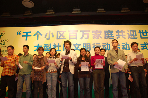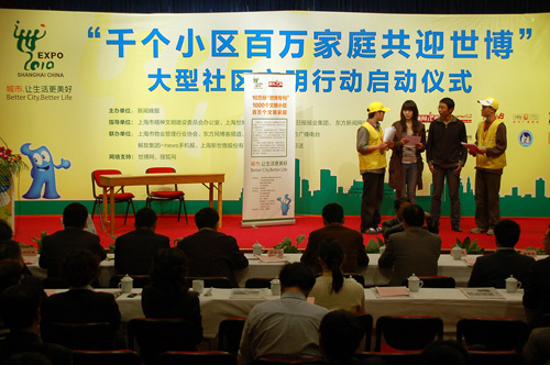 4月8日下午,“千個小區百萬家庭共迎世博”大型社區文明行動啟動儀式舉行。據悉,為了讓更多市民參與世博、服務世博,活動將從2009年4月一直持續到2010年10月結束。