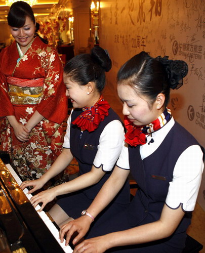慶典儀式通過圖片展和影像資料展示了從1989年至今的20年里的“凌燕”2光輝歷程。現(xiàn)場(chǎng)數(shù)十名“凌燕”機(jī)組人員通過調(diào)酒、烹飪、手語(yǔ)、太極等表演形式展現(xiàn)了“凌燕”組員多才多藝和“至尊、至誠(chéng)、至精、至美”的服務(wù)理念。