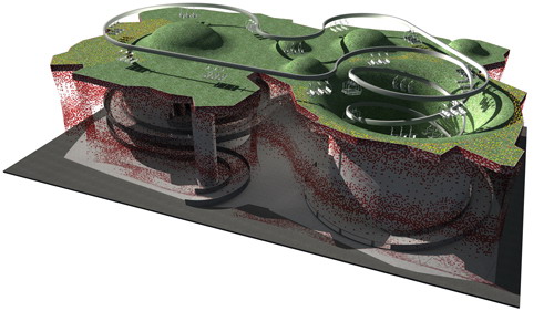 據(jù)了解,瑞士館主體結構由兩個承重的大小圓柱和綠草如茵的屋頂組成,館內底層展廳營造的都市空間和館頂?shù)淖匀豢臻g相互呼應,觀光纜車帶領參觀者往返其間,給人以身臨其境,在城市和鄉(xiāng)村之間優(yōu)游的美好感受。瑞士館另一大亮點是其互動閃光的帷幕外墻,將由半透明的鋁網結構帷幕覆蓋,11000塊包含敏化太陽電池的的生物樹脂懸掛其上,與展館周圍的能量如陽光和相機的閃光發(fā)生反應,整個外墻呈現(xiàn)一種動態(tài)閃光的視覺效果,以此展示能源的利用。