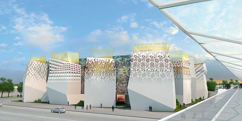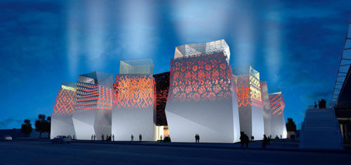 以“新俄羅斯:城市與人”為主題的俄羅斯館由12個(gè)塔樓和“懸浮在空中”的立方體組成,外形設(shè)計(jì)類似古代斯拉夫人的小村落,象征著生命之花、太陽以及世界樹(斯拉夫人枝葉繁茂的橡樹)的根。塔樓由白、金、紅三種顏色構(gòu)成,白色和金色塑造了俄羅斯建筑的歷史形象,而紅色底色加上富有俄羅斯各民族元素的圖案,則賦予了塔樓頂部鏤空部分以生命力。