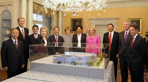 7月28日,正在華盛頓參加首輪中美戰略與經濟對話的中國國家主席胡錦濤特別代表、國務院副總理王岐山和國務委員戴秉國以及美國總統奧巴馬特別代表、國務卿希拉里·克林頓和財政部長蒂莫西·蓋特納27日在美國國務院共同為2010年上海世界博覽會美國館模型揭幕。