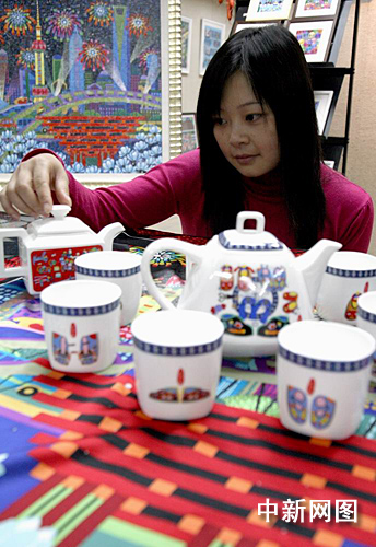 中新網(wǎng)11月24日電(萬軍)為迎接世博會到來,上海金山農(nóng)民畫院特地開發(fā)出系列世博題材創(chuàng)意延伸產(chǎn)品,其中A套以江南傳統(tǒng)繡花鞋為圖案、選用著名的唐山骨瓷為原料,名為“和諧”茶壺(喝與鞋的諧音),B套茶壺蓋則用世博會中國館圖案制成,一經(jīng)面世,即受到中外人士的關注。