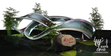 湖南館取名為“桃花源里·Xanadu”——Xanadu英文意為“世外桃源”,是西方世界描述神秘仙境時(shí)最廣泛使用的詞。湖南館的展示主題是“都市桃花源”。展館外觀之所以采用雙“魔比思環(huán)”相扣的造型,是取義無窮大符號(hào)“∞”和中國(guó)太極,這與和諧自然的中國(guó)理想城市意境以及長(zhǎng)株潭城市群“兩型社會(huì)”的理念相契合。“魔比思環(huán)”是雙環(huán)環(huán)繞,就單環(huán)而言展開長(zhǎng)度達(dá)100米,高3米,只有一個(gè)面和一個(gè)邊界。由于主體造型是不規(guī)則的建筑環(huán)體,對(duì)施工和投影都帶來了重大挑戰(zhàn)。