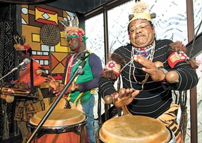 餐廳內用非洲圖騰繪制成彩色墻面,由鴕鳥蛋做成精致吊燈,樹枝和草帽拼接裝飾屋頂,頗具非洲原生態(tài)氛圍。餐廳二樓設有一個小舞臺,就餐時,身著非洲傳統(tǒng)民族服飾的非洲團隊還會在舞臺表演。(鐘怡 徐蒙)
