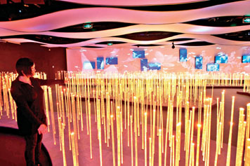 該館整體LED燈管約有11萬米,能夠形成三維的顯示矩陣。從5月1日開始,每天晚上閉館之前,將有這樣一個8分鐘左右的秀。經歷一個“魔方”蘇醒的過程,觀眾會聽到“魔方”的“心跳”,當“讓我們蕩起雙槳”音樂片段配合著企業聯合館的三維畫面,過去的片段在腦海中浮現。
