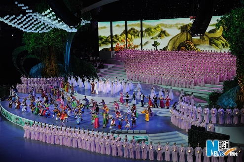 隨后,中國香港著名影星、上海世博會形象大使成龍也出現在舞臺上,與宋祖英一起演唱《和諧歡歌》,同時中國56個民族的舞者,也踏著慶典舞步,以中華民族共同的熱情,層層出現在舞臺上翩翩起舞,歡迎世界各地賓客的到來。