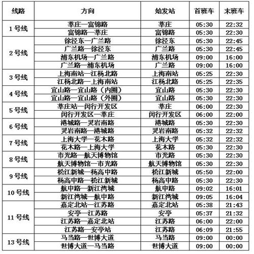 軌道交通4、6、7、8、9五條涉博線路在常規末班車后,將在世博園周邊站點加開加班列車,除重點涉博車站以外,其他途經車站只可下客出站,不可進站上客和換乘。加開列車末班車時間為0:10,運營間隔約為15分鐘一班。具體車站的首末班車時間還可查看各車站公告、至上海地鐵官網(/) 進行查詢或撥打地鐵服務熱線64370000進行詢問。