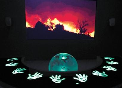 從“希臘的一天”中,游客看到了城市生活的繁忙與樂(lè)趣,也發(fā)現(xiàn)城市面臨的挑戰(zhàn)與難題。就像在“生態(tài)”那一章中:當(dāng)5位游客同時(shí)把雙手按在互動(dòng)桌上時(shí),屏幕上觸目驚心的環(huán)境污染立即消失,取而代之的是希臘為應(yīng)對(duì)挑戰(zhàn)而做的努力,如臨海而建的風(fēng)能發(fā)電場(chǎng)、居民住宅上的太陽(yáng)能屋頂?shù)取P⌒〉摹盎?dòng)”告訴我們:生態(tài)城市僅僅依靠一個(gè)人的努力是不夠的,同心協(xié)力,才會(huì)有“更好的生活”。(劉穎)