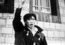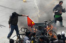 一名右手持鐵鏈的不法分子在焚燒中國國旗