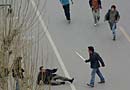 不法分子手持棍棒、匕首準備圍攻一名摔倒的男子
