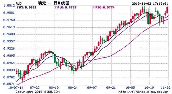 11月2日,出乎市場意料,澳大利亞聯儲再度將利率提高25個基點至4.75%,這已是該國在今年內的第四次加息,至此澳大利亞央行今年內共加息100個基點。消息一出,澳元兌美元立馬飆升,5分鐘內大漲100點,從0.9879開始最高觸及0.9979,至北京時間16時28分,澳元兌美元已突破平價水平,報1.0003。