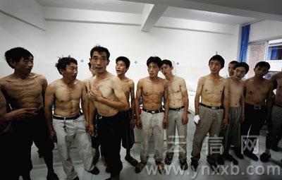 瘦骨嶙峋,根根肋骨外凸。15個赤裸著上身的男子,在病房里排隊照相留念,他們是鹽津縣鹽井鎮的一群矽肺病患者。面對死亡,他們臉上露出幾分苦澀的笑容,最大的愿望就是希望自己能夠活下去。