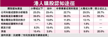 不過,即使在表示會初步了解公司資料者中,也有48.8%主要是透過“報(bào)紙報(bào)道及專欄分析”作為資料來源,13.1%則根據(jù)“電臺及電視節(jié)目推介”,只有24.7%的主要資料來源是“公司年報(bào)或證券行分析報(bào)告”。