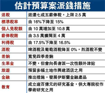 至于全港納稅人士預料今天也會收到喜訊。消息指,曾俊華將會在預算案中提出多項優惠納稅人的措施,包括增加免稅額、擴闊稅階和退稅等。退稅方面,消息指政府將退還七成五薪俸稅,上限為二萬五千元;而個人免稅額則回復至○二/○三年水平,由十萬元增加至十萬零八千元。薪俸稅標準稅率方面,由現時的一成六,降低至一成五;稅階則由三萬五千元擴闊至四萬元,惟邊際稅率可能維持不變。而為了增加營商競爭力,利得稅亦可能會相應調低一個百分點,至百分之十六點五。