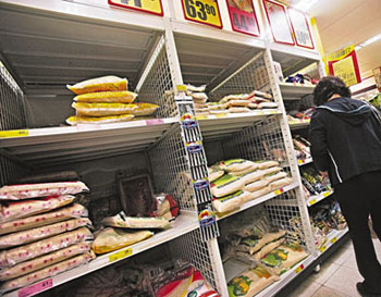 國(guó)際市場(chǎng)食用米供應(yīng)緊張和大幅加價(jià),令香港部分市民出現(xiàn)恐慌心理,紛紛到超市入貨。3月31日,一些超市的貨架上,部分牌子的泰國(guó)米已經(jīng)缺貨。有市民表示,擔(dān)心米價(jià)會(huì)再上升,所以入多點(diǎn)貨,有市民甚至用小推車一次性購(gòu)十幾包。不過(guò),也有市民表示并不擔(dān)心,因?yàn)椤耙话卓梢猿院芫谩薄?