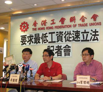 工資保障運動推行超過年半以來成效不彰,立法規管最低工資似乎勢在必行。工聯會理事長黃國健、立法會議員王國興和權益委員會主任葉偉明9日一同召開記者會,公布該會研究部就立法規管最低工資的研究結果。