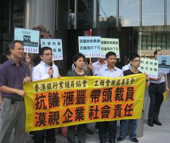 匯豐裁減人手,香港工會(huì)立即發(fā)起抗議。工聯(lián)會(huì)26日聯(lián)同香港銀行業(yè)雇員協(xié)會(huì)十名會(huì)員,到中環(huán)匯豐銀行總行抗議,不滿匯豐銀行“帶頭”裁員,不體恤員工的壓力和辛苦,其后匯豐銀行派人接收請(qǐng)?jiān)感拧?/p>