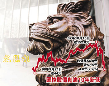 匯控20日在倫敦股市繼續(xù)下挫,中段股價(jià)跌逾4%至480便士,相等于51.94港元。于20日晚11時(shí)10分,匯控美國預(yù)托證券(ADR)折算每股報(bào)52.81港元,較香港收市再跌4.69港元,預(yù)示匯控21日仍會(huì)續(xù)跌。