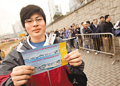解放軍駐港部隊13日晨8時半起,在中環及槍會山兩個軍營門外派發參觀兩艘導彈護衛艦的入場券,每人可憑身份證領取最多2張入場券。在中環軍營門外,未正式派發已有數百名市民在門外守候,排頭位的鄒先生更在12日晚10時開始便已通宵輪候。有市民在領取2張入場券后,即到“龍尾”再次排隊領取,希望可與更多親朋好友一同參觀戰艦。