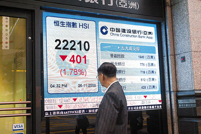 中新網(wǎng)11月27日電 據(jù)香港《文匯報》報道,市場擔心若迪拜世界一旦破產(chǎn),會令多間主要借款銀行,包括匯控在內(nèi)的歐洲大型銀行需要大額撇帳。亞太區(qū)股市普遍走弱,內(nèi)地及港股也不能幸免,恒指26日曾跌500點,尾市跌幅略收窄,但也跌401點,收22210點,跌幅1.78%,成交773億元。