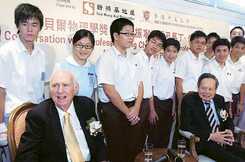 香港中大及新鴻基地產昨日第八度舉辦“新鴻基地產諾貝爾獎得獎學人杰出講座系列”,今年邀請兩名諾貝爾物理學獎得主楊振寧和馬丁•佩爾出席講座,與百多名學生真情對話。有學生提到香港與美國學生的分別時,楊振寧指美國與香港的教學哲學距離甚大,香港學生由小學、中學開始便會操練數學,數學較理想。他又推薦年輕人閱讀《雙螺旋》,故事講述一名年輕人努力不懈,最后成功發表“雙螺旋”理論,獲得諾貝爾生物獎。