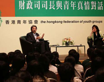 中新網3月18日電 據香港大公報報道,香港財政司司長曾俊華17日獲邀與青少年面對面真情對話,全程展現其親民的一面。他以制定財政預算案的三個理財信念,即社會承擔、可持續性和務實態度,勉勵青少年要為自己制訂個人發展目標。學生整體滿意曾俊華的表現,給予他9分的高評分。