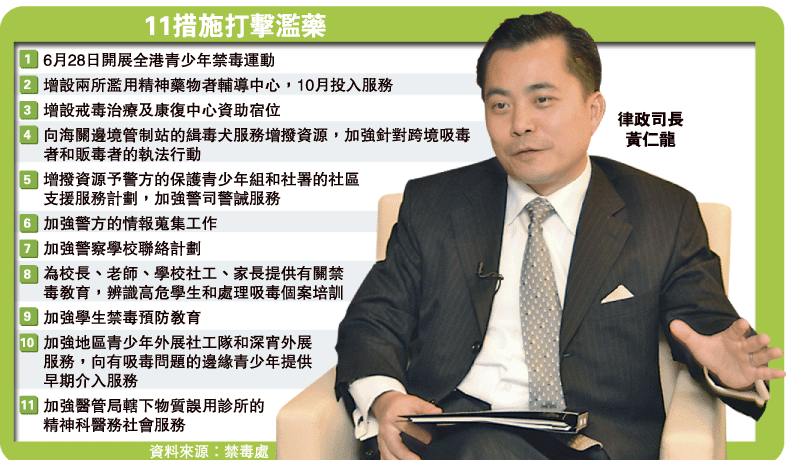 中新網3月25日電 據香港明報報道,由香港律政司長黃仁龍領導的打擊青少年濫藥專責小組,已初步敲定11項跨政府部門措施,包括增設兩所青少年戒毒輔導中心,并額外增聘逾50名社工及外展隊人手,料今年10月可投入服務。