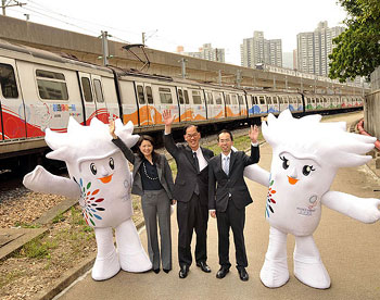 該三列色彩繽紛的港鐵列車,以東亞運吉祥物“東仔”和“亞妹”所展示的比賽項目作裝飾,19日起在港島線、九龍線及荃灣線行走。