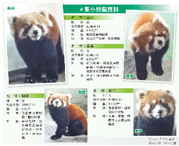 成都大熊貓繁育研究基地向海洋公園借出的4只小熊貓,名字分別叫泰山、聰聰、柔柔和栗子,兩雄兩雌,現(xiàn)時(shí)仍未滿(mǎn)1歲,平均只有8至9個(gè)月大,屬基地繁殖的第二代小熊貓,各有不同性格及特征。