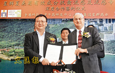 據悉,二零零三年香港發生嚴重急性呼吸系統綜合癥(SARS)期間,科大中藥研發中心的團隊已致力于中藥抗禽流感有效性的研究。經過數年的科學研究引證,從星群夏桑菊提取出的脂溶性有效成分對人類的甲型流感、乙型流感和禽流感都起著防治作用。科大期望與廣藥集團未來能開發夏桑菊新制劑,制成供人用或動物對抗流行性感冒病毒的藥物或消毒防疫藥品。