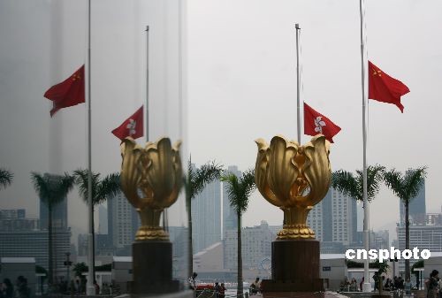 五月十九日是全國哀悼日,香港金紫荊廣場下半旗,對四川大地震遇難者表示深切哀悼。 中新社發 武仲林 攝