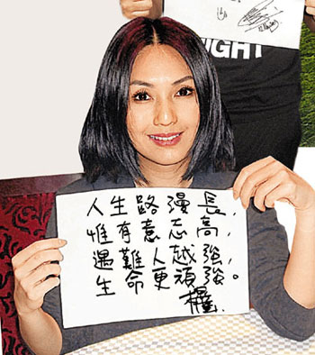 經(jīng)歷一年的恢復(fù),千嬅贊賞政府重建災(zāi)區(qū)的速度很快,像曾受災(zāi)的北川或會再有余震,現(xiàn)移往新地方重建了另一個北川,好讓民眾重新開展新生活,自給自足。千嬅明白這不是一時三刻可以完全復(fù)元過來,重建項目尚要很多年才能真正成功。但令千嬅最欣慰的是:“去年到災(zāi)區(qū)時,城里每個人臉上都是鎖緊愁眉,這次重臨舊地,就看到連小朋友都變得開懷了,臉上有掛上笑容,問他們的志愿,大家異口同聲說想做醫(yī)生將來去幫人,所看到的都是充滿生存的意志,這也就是中國人的特質(zhì),擁有頑強的生命力和團(tuán)結(jié)一致的精神!”