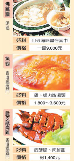 其中福臨門就是眾所公認的富豪飯堂,脆皮雞、燕窩、魚翅與荷葉糯米飯,在質量與口碑上都是一等一,價格也成正比,以套餐為例,一客魚翅、25頭吉品鮑、龍蝦、乳鴿、炒飯加燕窩要港幣2500元。此外鮑魚大王楊貫一的富臨飯店、四季酒店中米其林三星的龍景軒也都算得上是富豪飯堂。