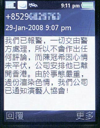 據(jù)了解,部分裸照可能源于一部已遺失或曾交予他人修理的手提電腦,不過,事件關鍵人物陳冠希,其經(jīng)理人29日通過手機短訊回應傳媒時指出,由于陳冠希心情未平復,公司安排他離開香港。