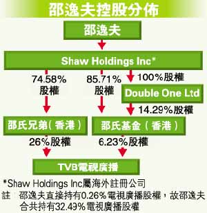 目前邵逸夫透過邵氏兄弟(上市公司)、邵氏基金及個(gè)人直接持有,合共持有電視廣播32.49%股權(quán)。若有買家對(duì)電視廣播有興趣,可向邵氏直接購入電視廣播股權(quán),或收購市值較低的邵氏兄弟,達(dá)至以較低成本間接控制電視廣播。