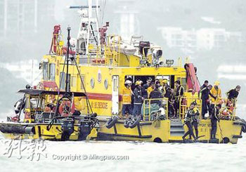 撞船意外后,香港多個(gè)部門連續(xù)兩晚通宵搜救,10艘水警輪、6艘海事處船舶、5艘消防船和5架飛行服務(wù)隊(duì)直升機(jī)先后參與救援,但一直未有失蹤者音信。消防處表示,23日每次派出一組兩人的蛙人,9度潛入海底搜索,且曾經(jīng)接近船身,以直接敲打方式測試有否生命跡象,可惜絲毫沒有反應(yīng),蛙人也未能進(jìn)入船艙。