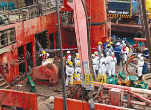 大批災(zāi)難辨認(rèn)小組警員在補(bǔ)給船上進(jìn)行搜尋尸體工作。(圖片來(lái)源:文匯報(bào))