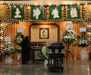 靈堂設(shè)于世界殯儀館一樓世界堂,布置莊嚴(yán)肅穆,靈堂正上方懸掛著“往生凈土”的橫幅,兩旁是“浩氣長(zhǎng)存、哲人其萎”的挽聯(lián),下方擺放了蘇志豪生前的軍裝遺像,兩旁擺放著親屬敬獻(xiàn)的花籃,靈堂四周圍著白布,擺滿各界人士敬獻(xiàn)的花圈,兩輛紙?jiān)?duì)電單車放在靈堂旁邊。