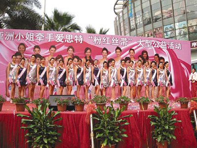 亞洲小姐競選活動頻密,20位佳麗18日出席在中山舉行的“粉紅絲帶”公益活動。(圖片來源:文匯報)