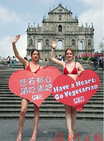 兩名性感內(nèi)衣女郎12日中午12時現(xiàn)身旅游旺區(qū)——大三巴牌坊,兩人手持心形的“您若有心,請吃素吧”標(biāo)語。兩人是善待動物組織成員,來到澳門主要傳遞“素食對身心均有益處”和“吃素是對我們自己、動物及地球最好的情人節(jié)禮物”等訊息。